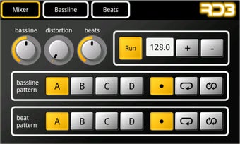 RD3 グルーブボックスのインターフェースは「Bassline」「Beats」「Mixer」の3つのタブで構成されています。「Bassline」タブ内のキーボードを弾いてベースラインを、「Beats」タブ内のドラムを組み合わせてビートを作成していきます。ベースラインとビートは、それぞれ4つまでパターンを作成する事ができます。「Mixer」タブ内の「Run」ボタンをタップすれば、ビートとベースラインが統合されて曲がスタートします。曲の再生中にベースラインとビートのパターンを変えて、曲に流れをつけていきましょう。楽譜が読めなくても、立派に楽曲が出来上がります。