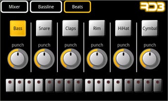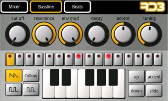 RD3 グルーブボックスのインターフェースは、「伝説の名機」と呼ばれているシンセサイザー「ローランドTB-303」に倣って作られています。TB-330と同様に「Bassline」には6つのツマミが並んでおり、「cut off(音色の明るさ調整)」「resonance(音色を特徴づける)」「env mod(音の鳴り始めから終わりまでの音色に変化を付ける)」「decay(音が消えるまでの時間の長さの調節)」「accent(アクセントの調整)」「tuning(チューニング)」等のフィルター(効果)を加える事ができます。古くからのテクノやハウスミュージックファンには嬉しい仕様の音楽アプリと言えます。